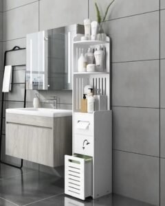 Optimisez votre salle de bain avec ce meuble colonne en bois composite, conçu pour organiser efficacement vos produits de toilette tout en occupant très peu d’espace au sol. Son design vertical et ses compartiments intelligents offrent un rangement pratique, moderne et élégant.